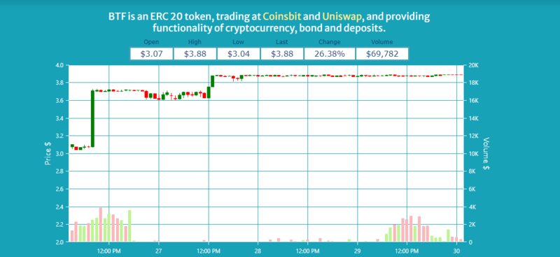 Uniswap - крупнейшая децентрализованная биржа криптовалют (см. CoinMarketCap) с ежедневным объемом более 260 миллионов долларов США (23.10.2020). Первая сделка по BTF / ETH была совершена 26.09.2020: 1 BTF = 0,000013519 ETH (0,004691 $). За первые 3 недели цена превысила $ 0,7 (+ 15 000%), количество держателей токенов достигло 35.